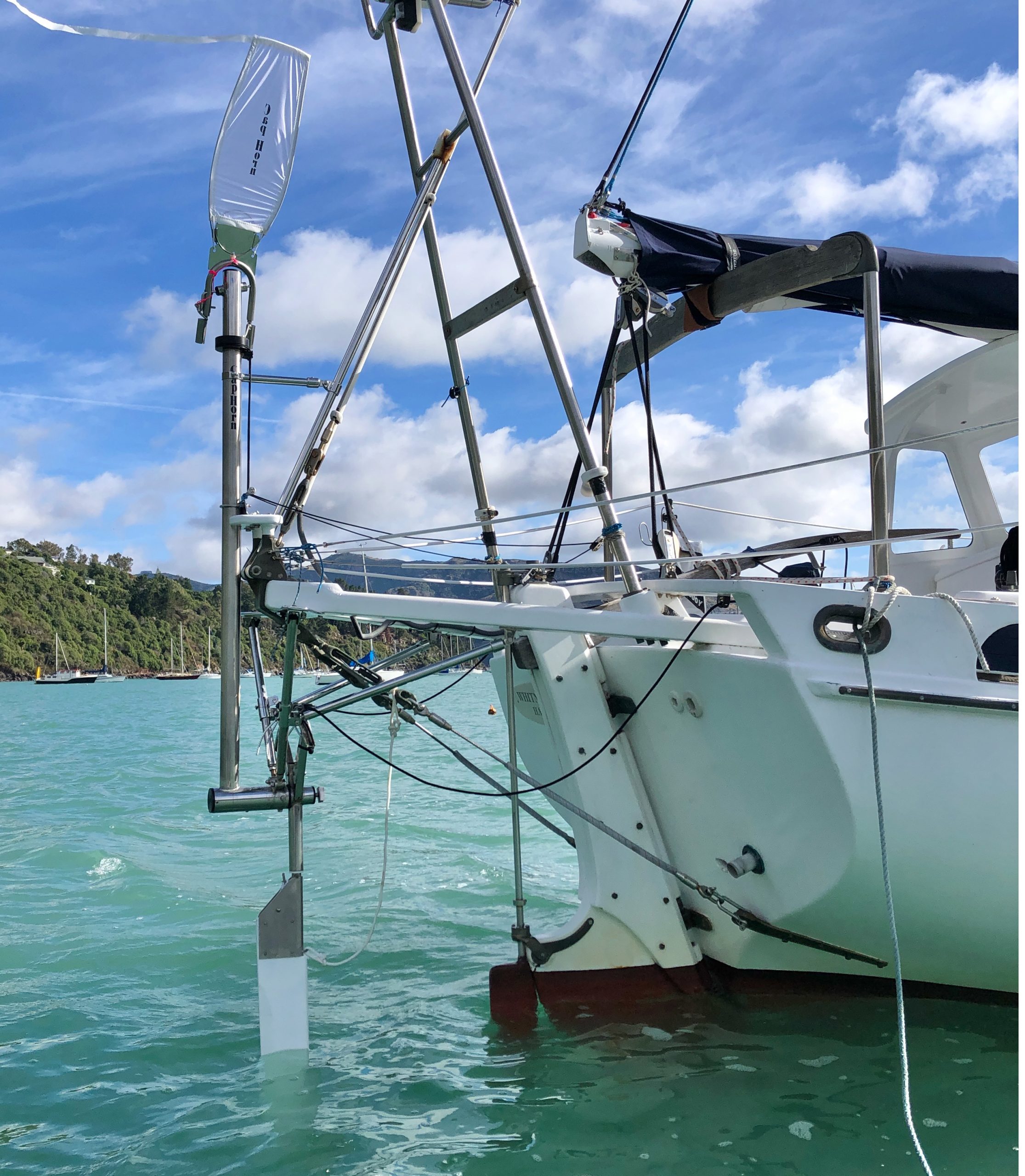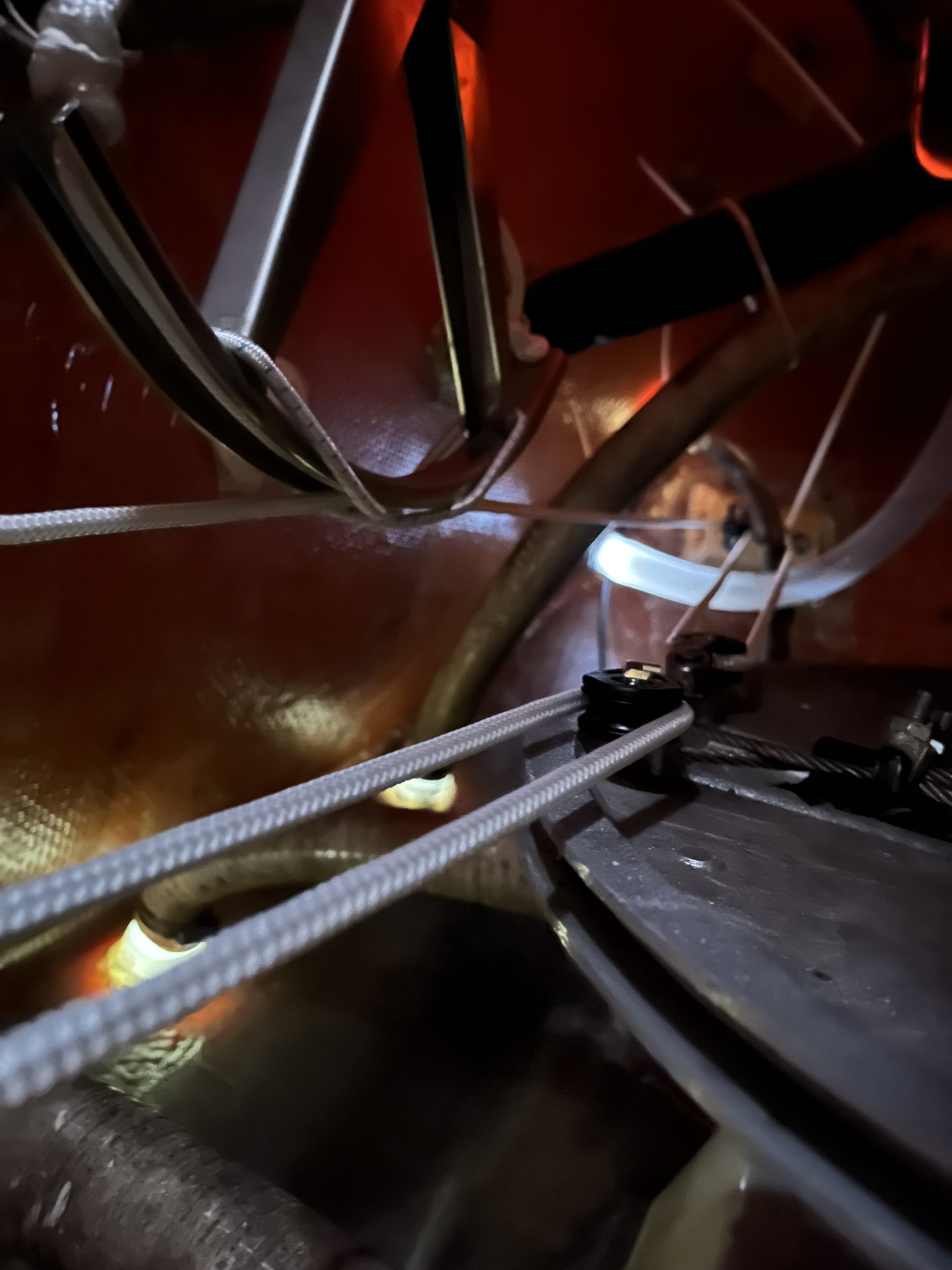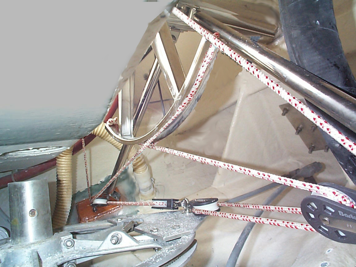 With his wife and two teen-age daughters as crew, Rolland Trowbridge wanted to sail Precipice, a 32’ gaff-rigged cutter he had built himself, through the North-West passage. He needed a compact, sturdy integrated installation, but there was no space inside for the CapeHorn control arm. Instead, we welded eyes on the tube supporting the servo-pendulum for our control lines and led them to blocks on the back of the rudder head.