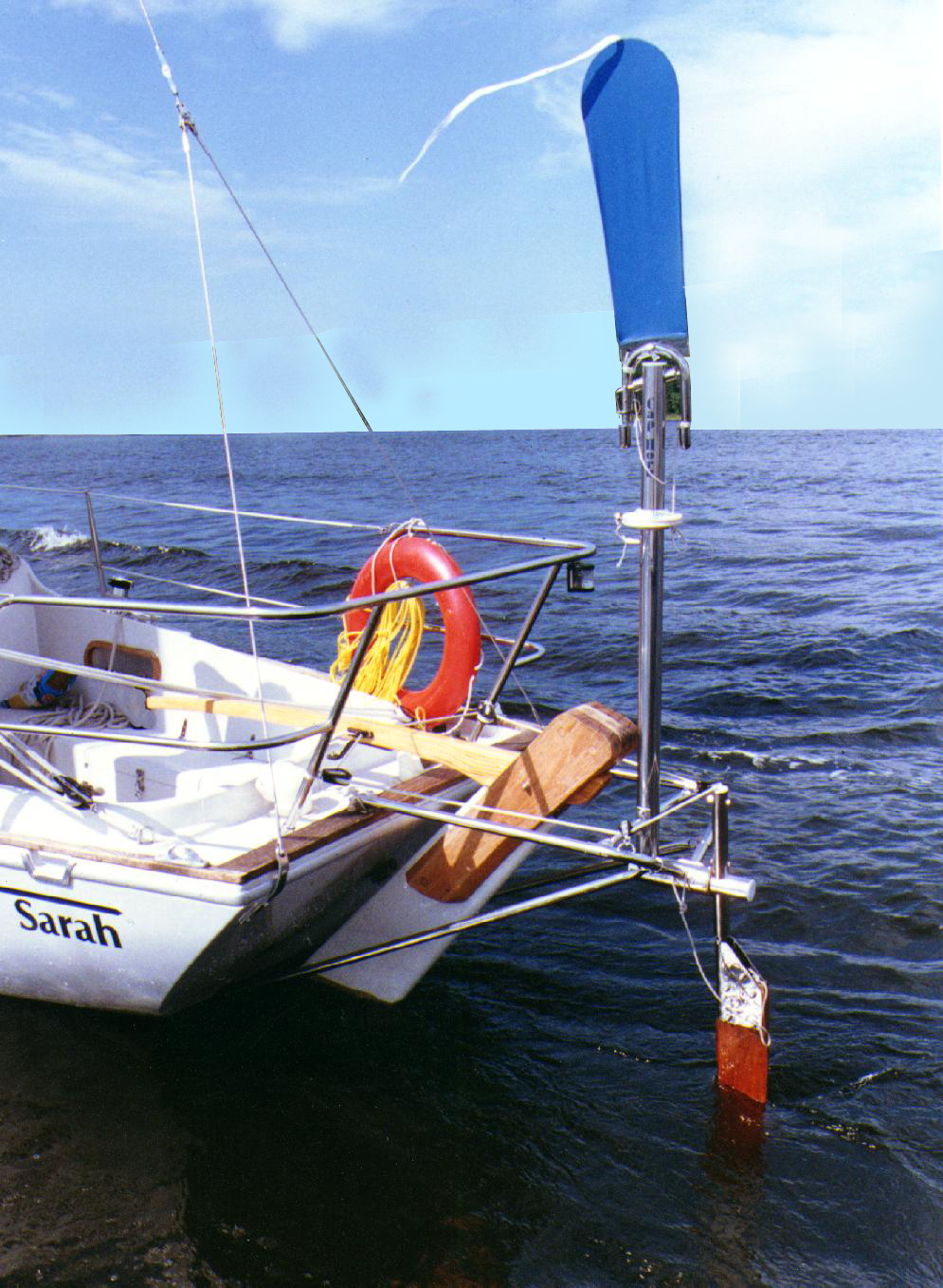 My Alberg 30 Jean-du-Sud has a lovely classic transom, and to make the gear that would make it steer itself as discrete as possible, I hid some of it the lazarette. A horizontal tube passes through the transom, its forward end supported by a pair of struts; inside it, another smaller tube links the servo-pendulum trailing outside to a control arm inside, with lines to the boat’s steering gear. A vertical tube links the servo-pendulum to a vane in clear air above. I could not make it more discrete, or more solid, the gear being as strong as the stern of the boat.